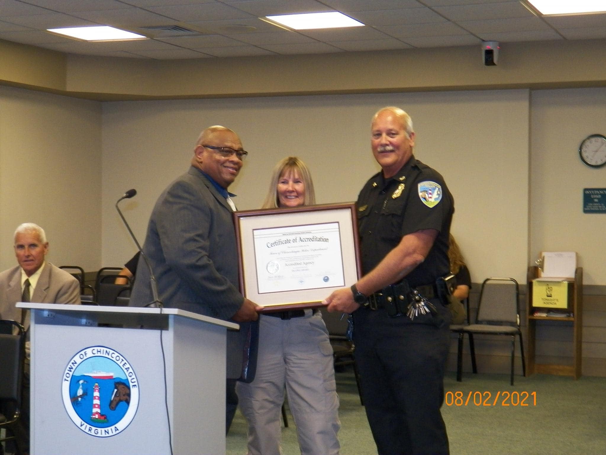 The Chincoteague Police Department was presented our 3rd award for a Virginia Law Enforcement Professional Standards Commission (VLEPSC) Reaccredited Police Department. Our initial accreditation was in January of 2012. This award was supposed to be presented in 2020, but did not happen due to the pandemic. Pictured are DCJS Accreditation Program Manager Derrick Mays presenting the award, Chincoteague Police Accreditation Manager Amy Lewis and Chief R.K. Fisher.